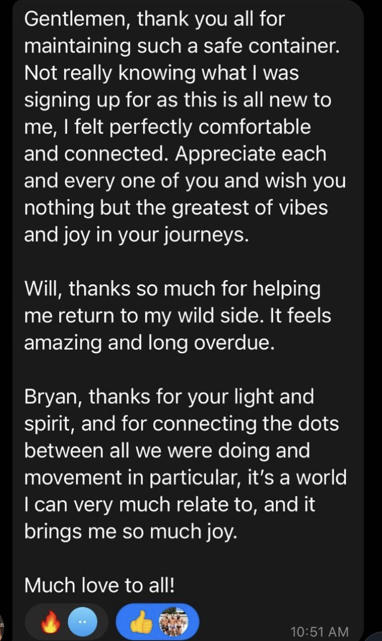 "In this challenge, Will and the Manhood Academy facilitators provide a safe & empowering container for men of all kinds to show up as we are and be challenged, motivated & inspired to expand our personal sexual relationship with ourselves thus strengthening our connections with others—regardless of their gender or sexual expression. It was a beautiful wxperience of learning, community & brotherhood."